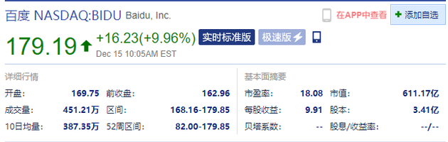 新浪科技讯 12月15日晚间消息,百度盘中涨近10%,刷新2019年4月份以来盘中高位至179美元上方,此前媒体报道称,该公司与吉利汽车等数家车企初步接洽组建电动汽车合资企业的事宜配资炒股炒股,双方均回应称不予置评。