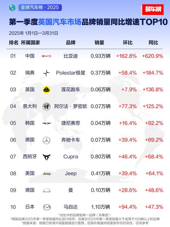 英国:比亚迪一季度销量同比暴增620%至0.93万辆,超越2024年全年销量,宋Plus DM-i更成为该国3月最畅销插混车型,门店网络已覆盖伯明翰、曼彻斯特等核心城市。